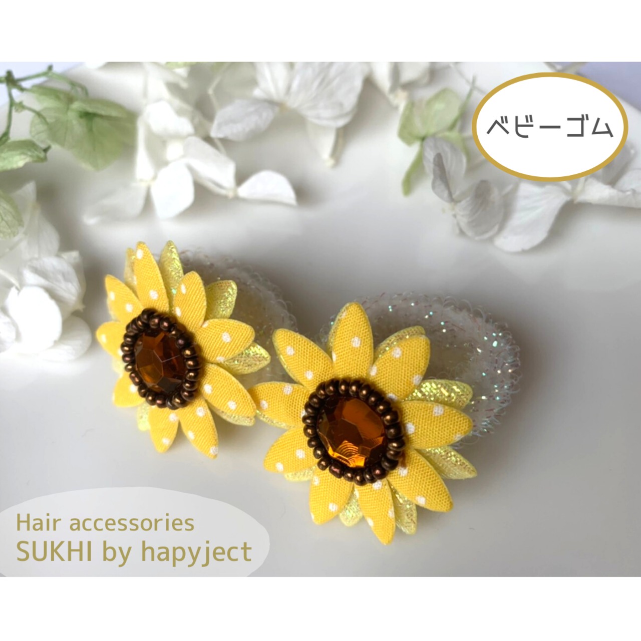 ストーン付ドットパールフラワーヘアゴム2個セット(yellow/brown)