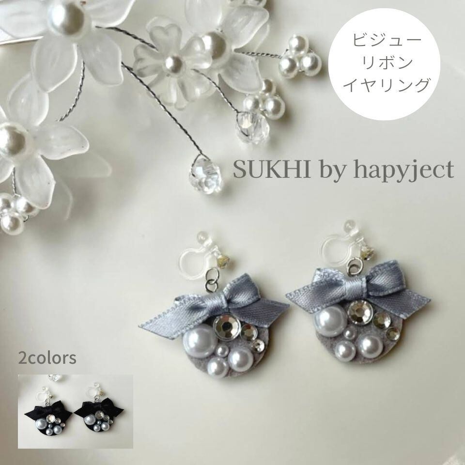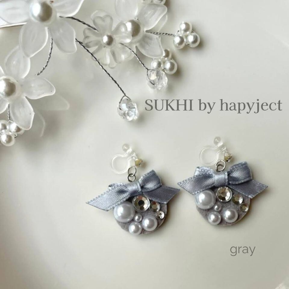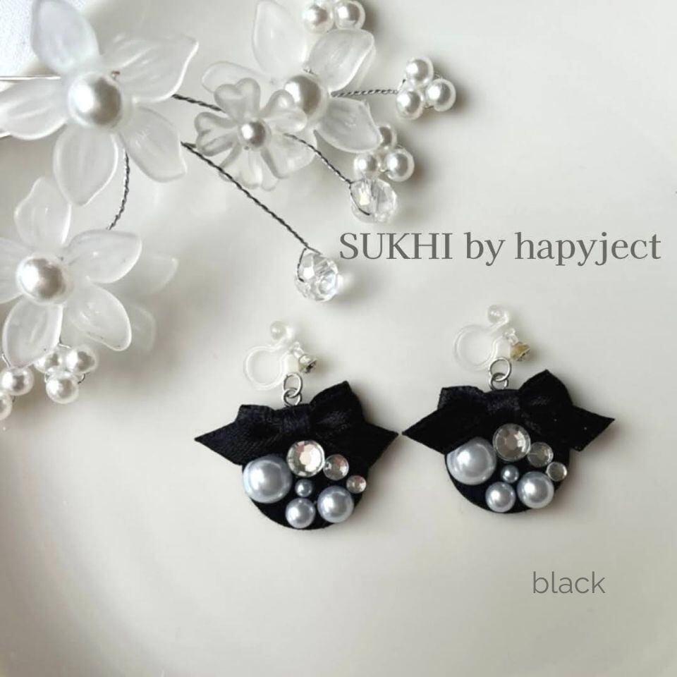 光沢のあるサテンリボンとパールやストーンが散りばめられたキラキラ光る上品なイヤリングです。