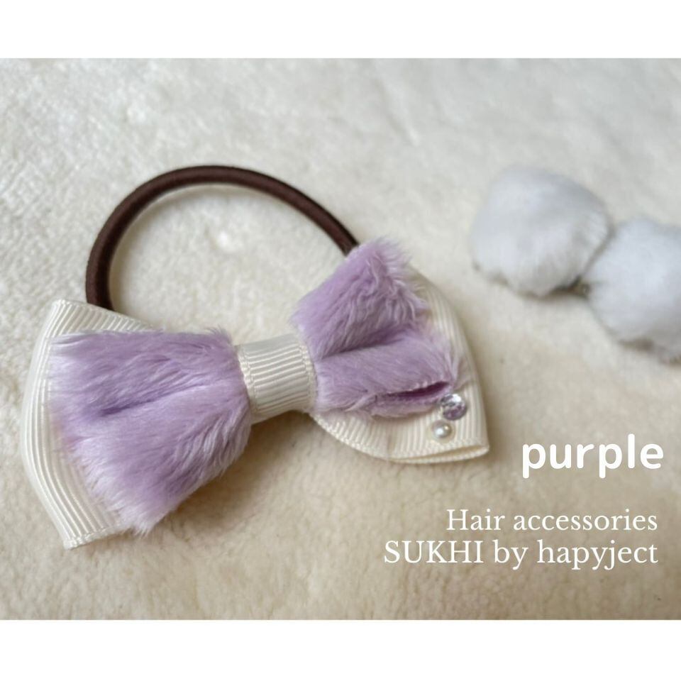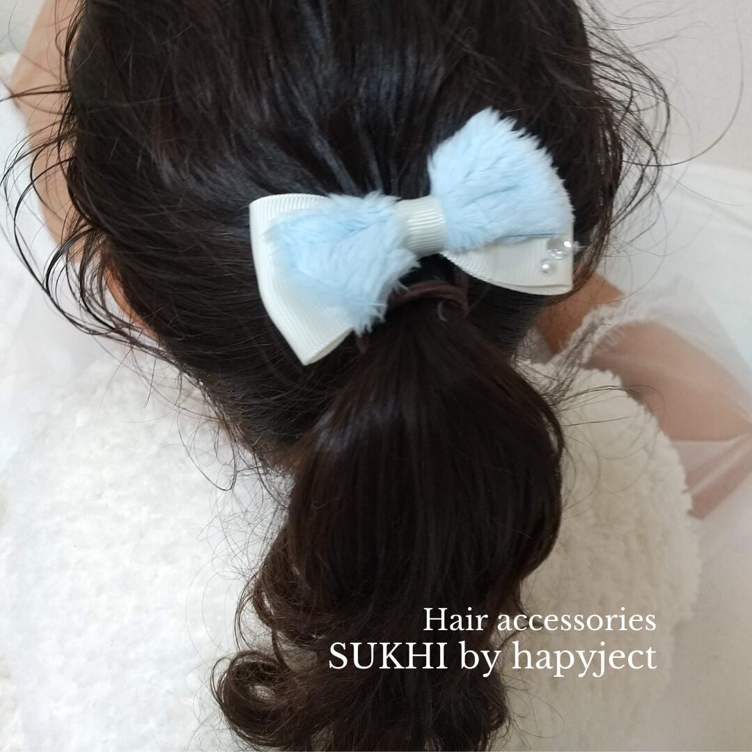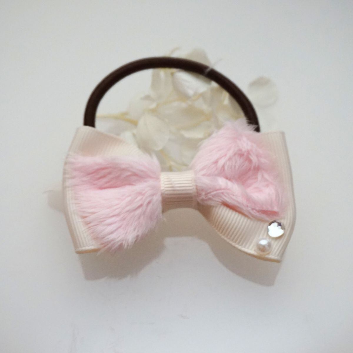 ふわふわのファー布地リボンを重ねた可愛らしいヘアゴム