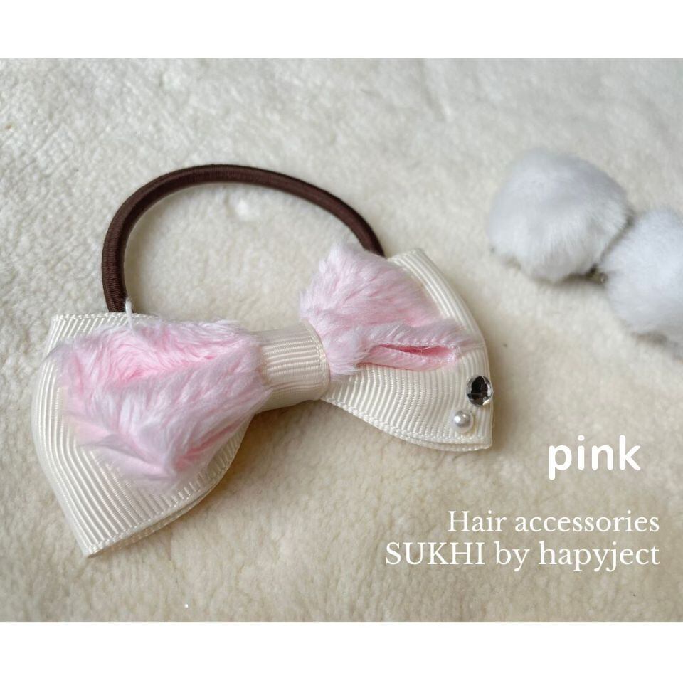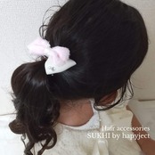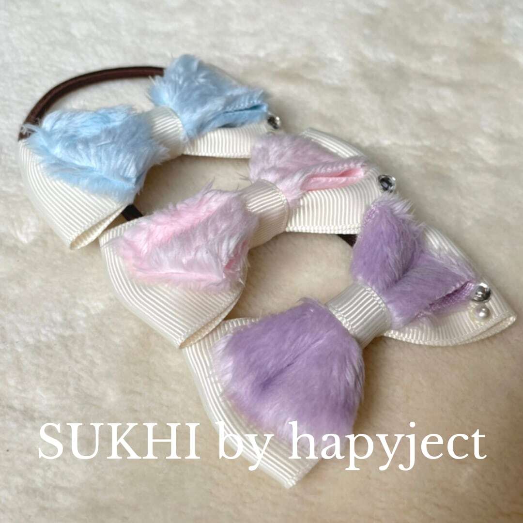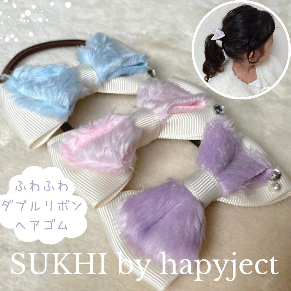 ふわふわのファー布地リボンを重ねた可愛らしいヘアゴム