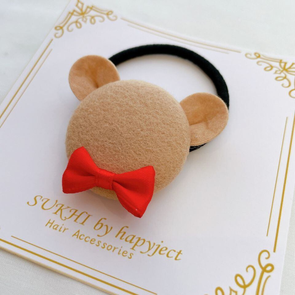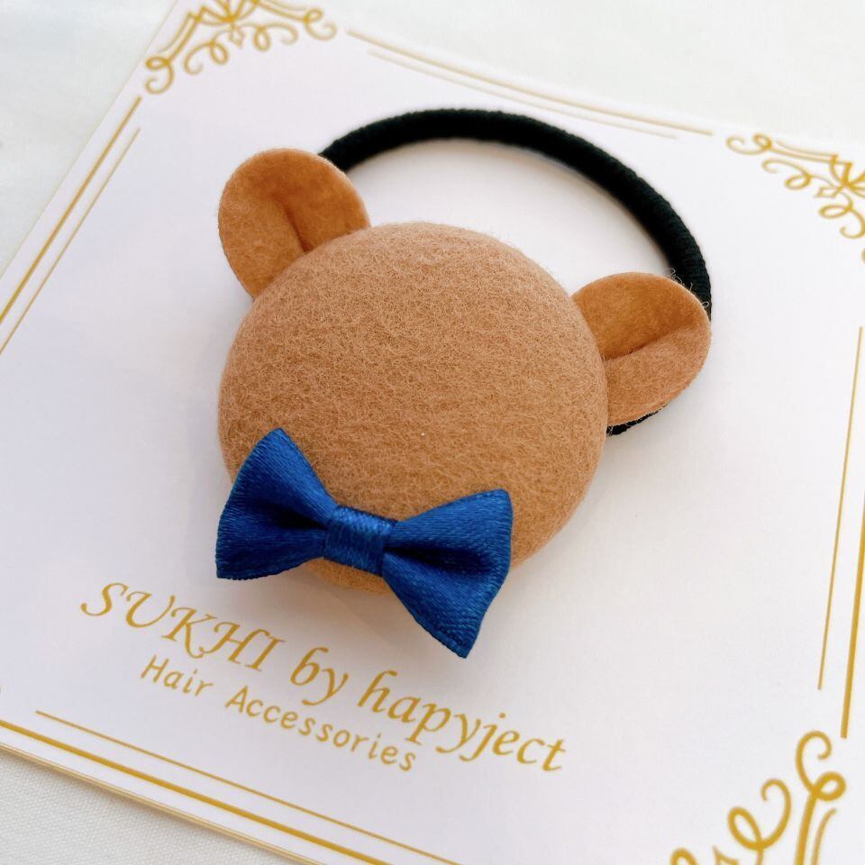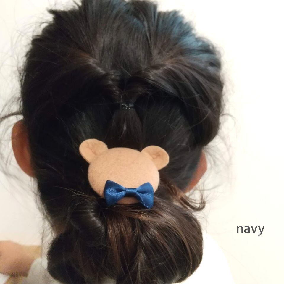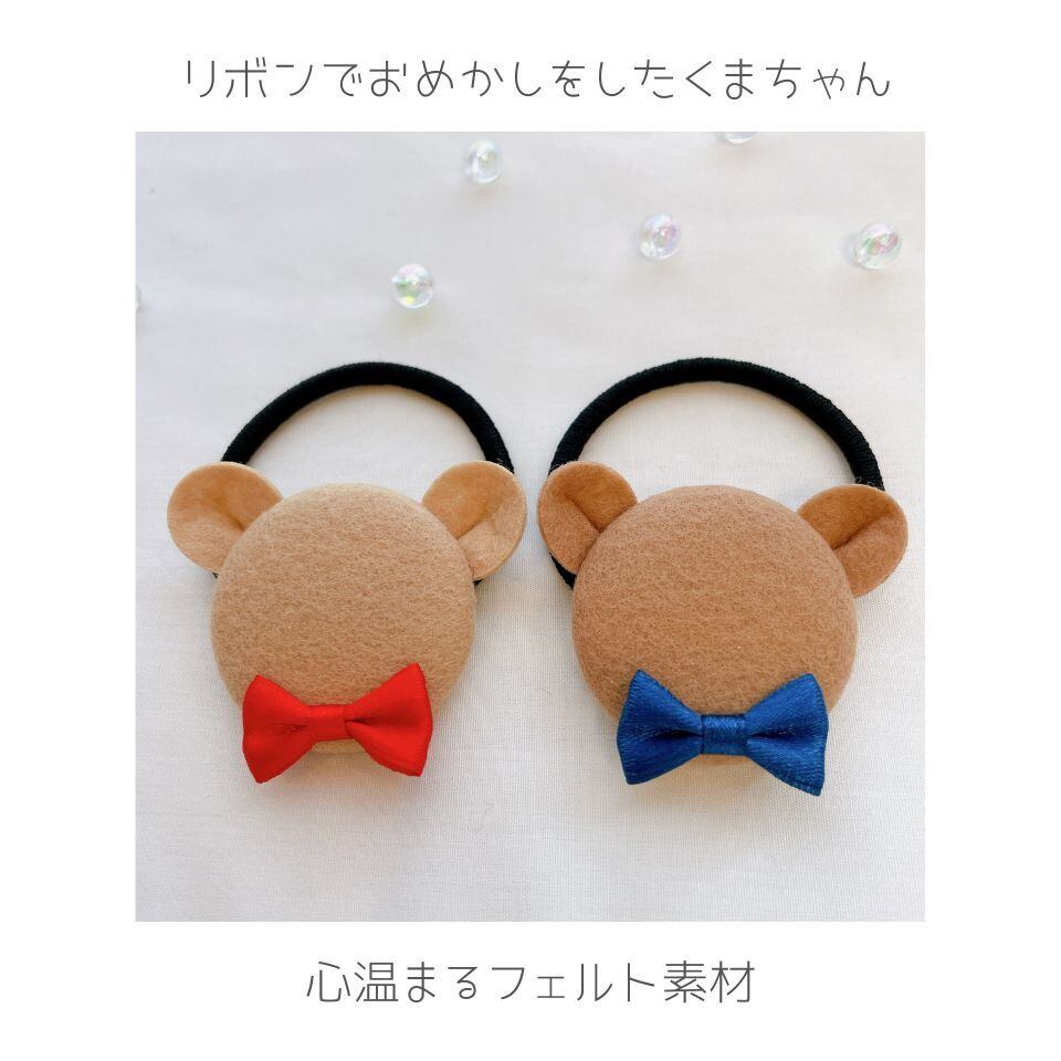 リボンを付けたおしゃれなくまさんのヘアゴムです。くるみボタンをフェルトでくるんでいるので、温かみがありつつしっかりとした作りです。女の子のオシャレのお供にいかがですか?