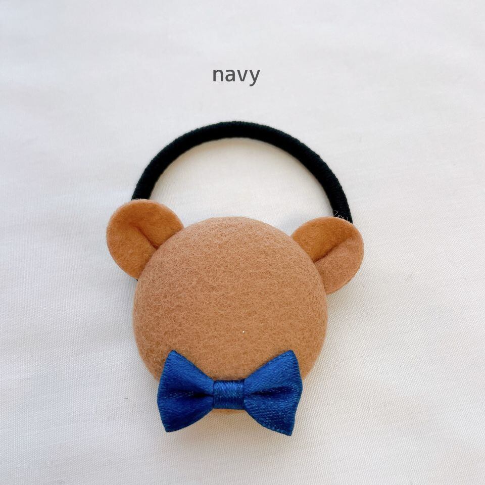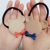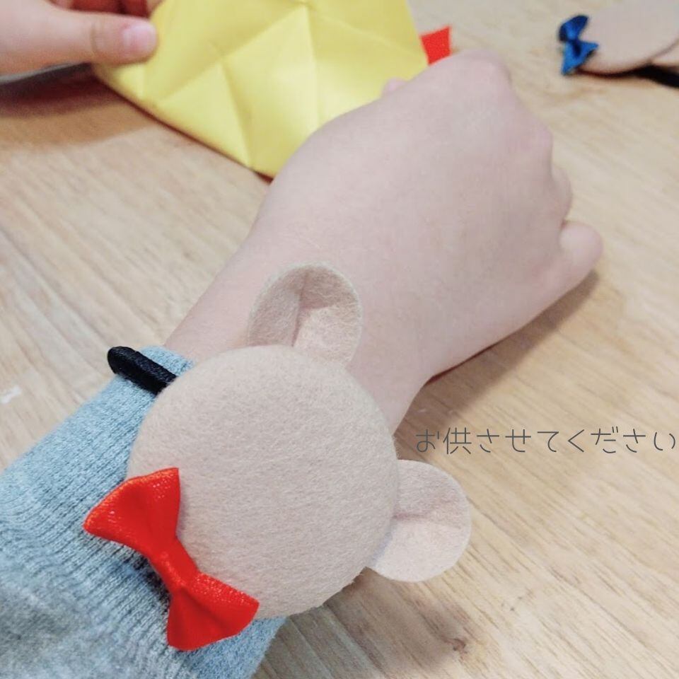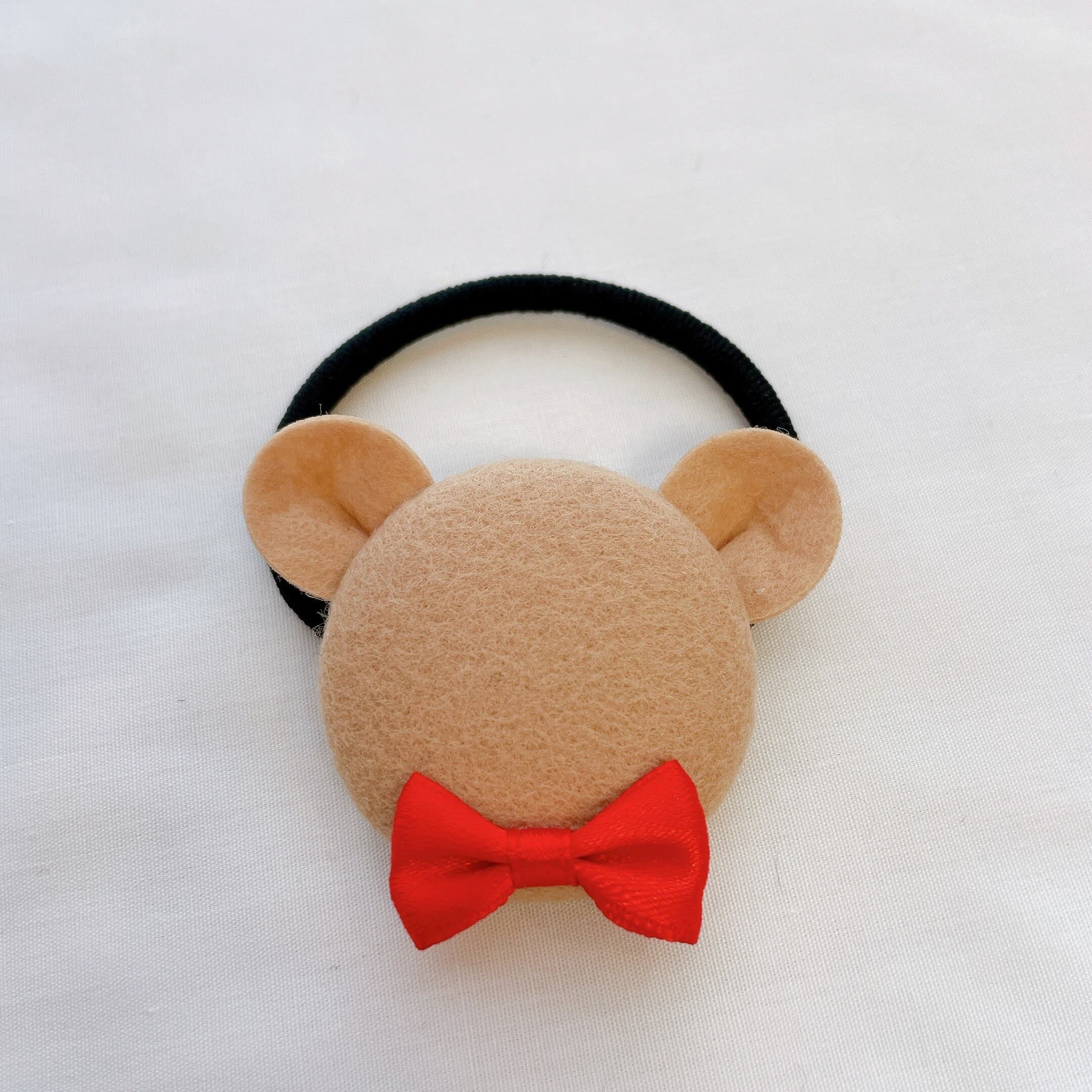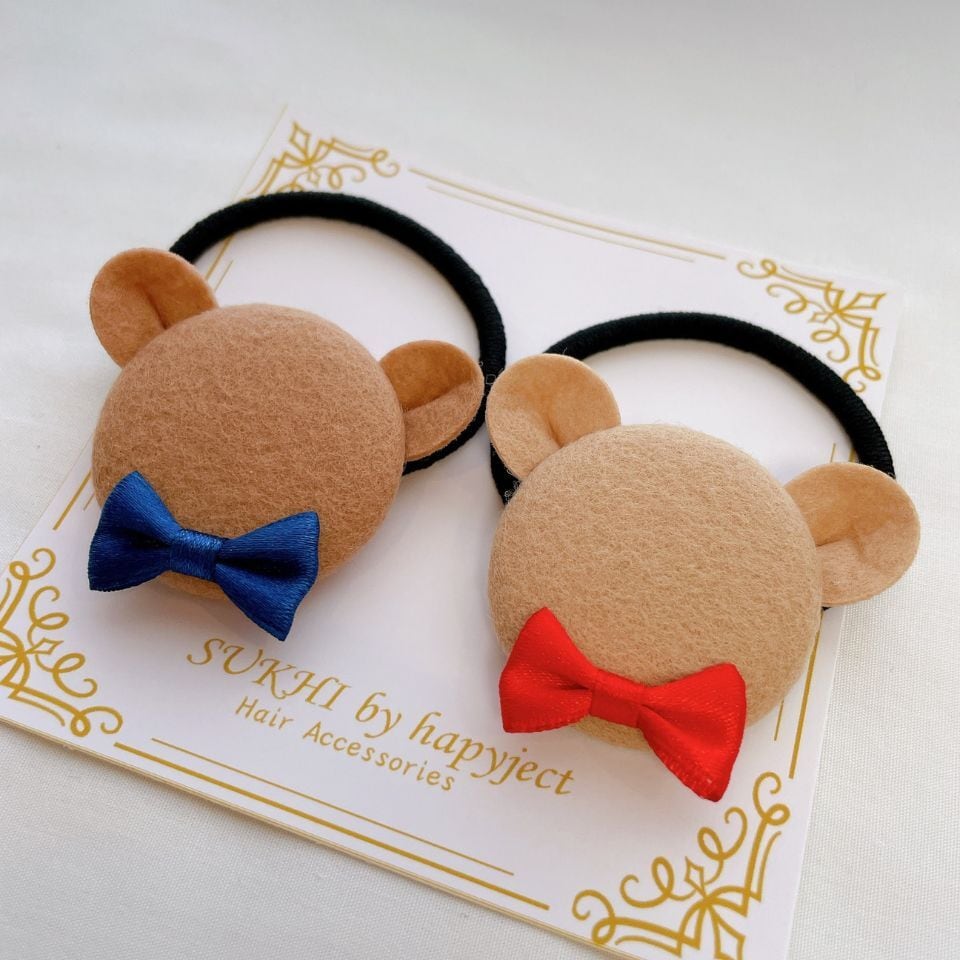 リボンを付けたおしゃれなくまさんのヘアゴムです。くるみボタンをフェルトでくるんでいるので、温かみがありつつしっかりとした作りです。女の子のオシャレのお供にいかがですか?