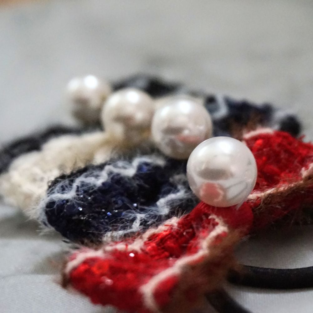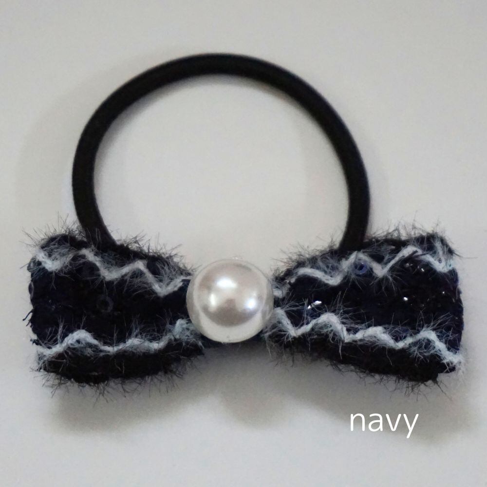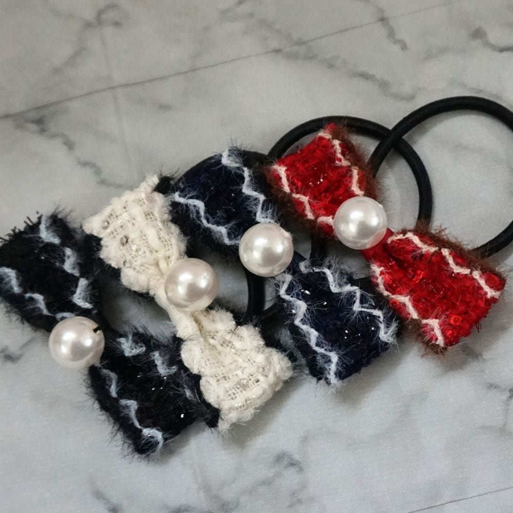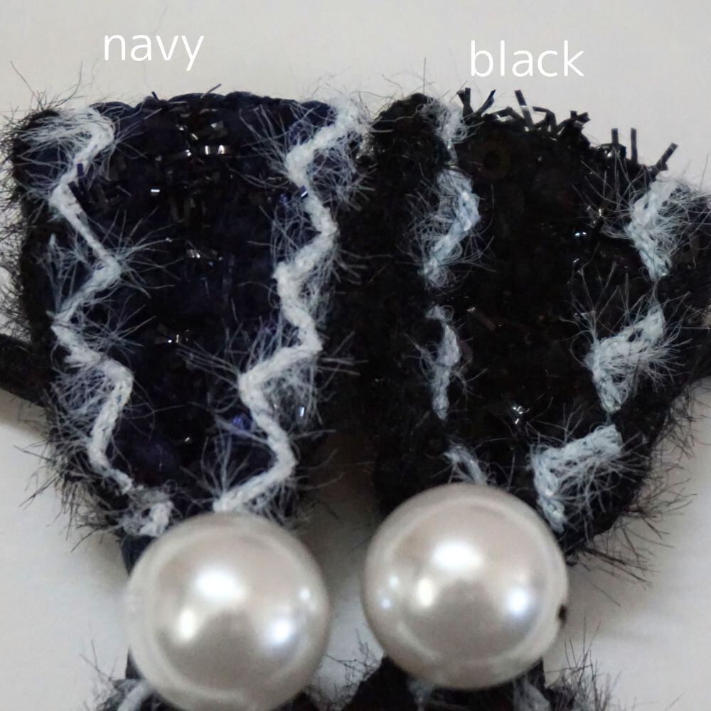 更にそんなツイードリボンを引き立てるのが、存在感抜群のパール。
