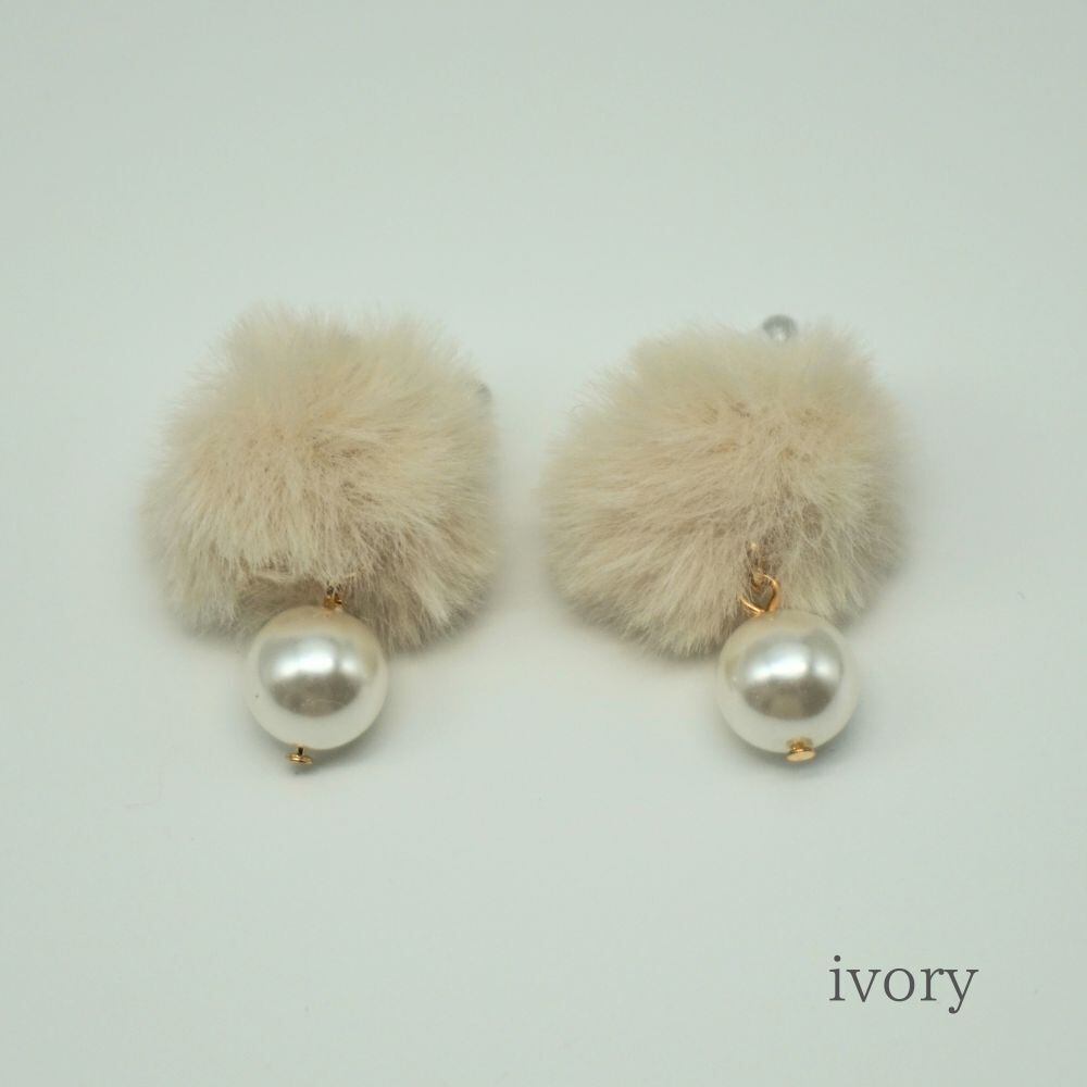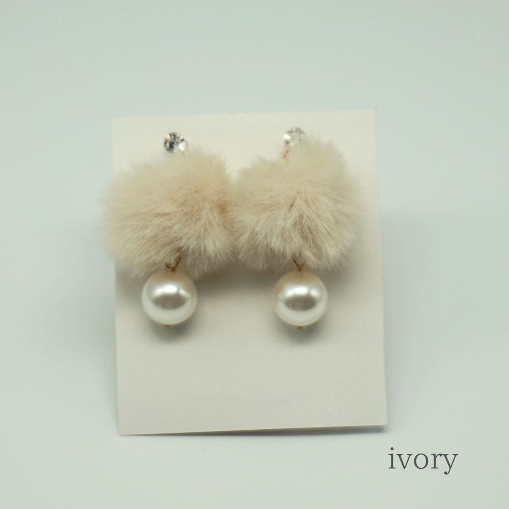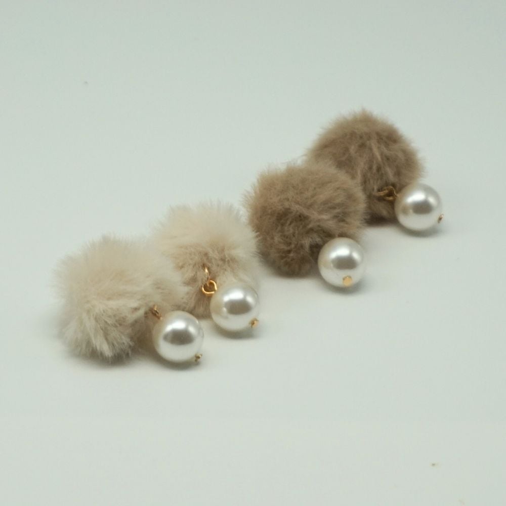 優しいラテカラーのファー生地のポンポンとパールの樹脂製のイヤリングです。 ふわふわ柔らかいポンポンからゆらゆらと揺れるパールがポイント。 冬のファッションの主役級の可愛さです。